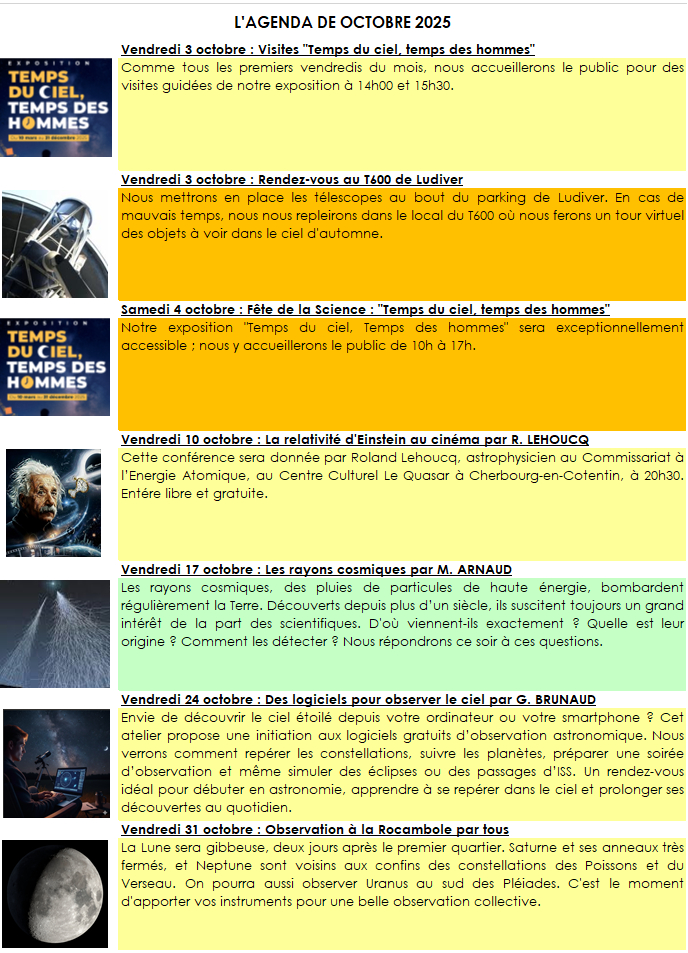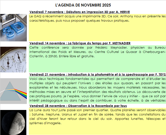 Les réunions hebdomadaires du GAQ ont lieu à la Ferme de la Rocambole, au 61, rue Roger Glinel à Querqueville. Certaines d’entre elles se tiennent dans le local du télescope de 600 mm de Ludiver. Vous pouvez aussi assister à nos réunions en distanciel : les membres reçoivent un lien de connexion Zoom via la liste de diffusion GAQ-Membres ; les nouveaux venus peuvent demander ce lien en envoyant un mail à gaq.astro@free.fr. Les réunions consacrées à l’observation ne sont pas accessibles en distanciel.