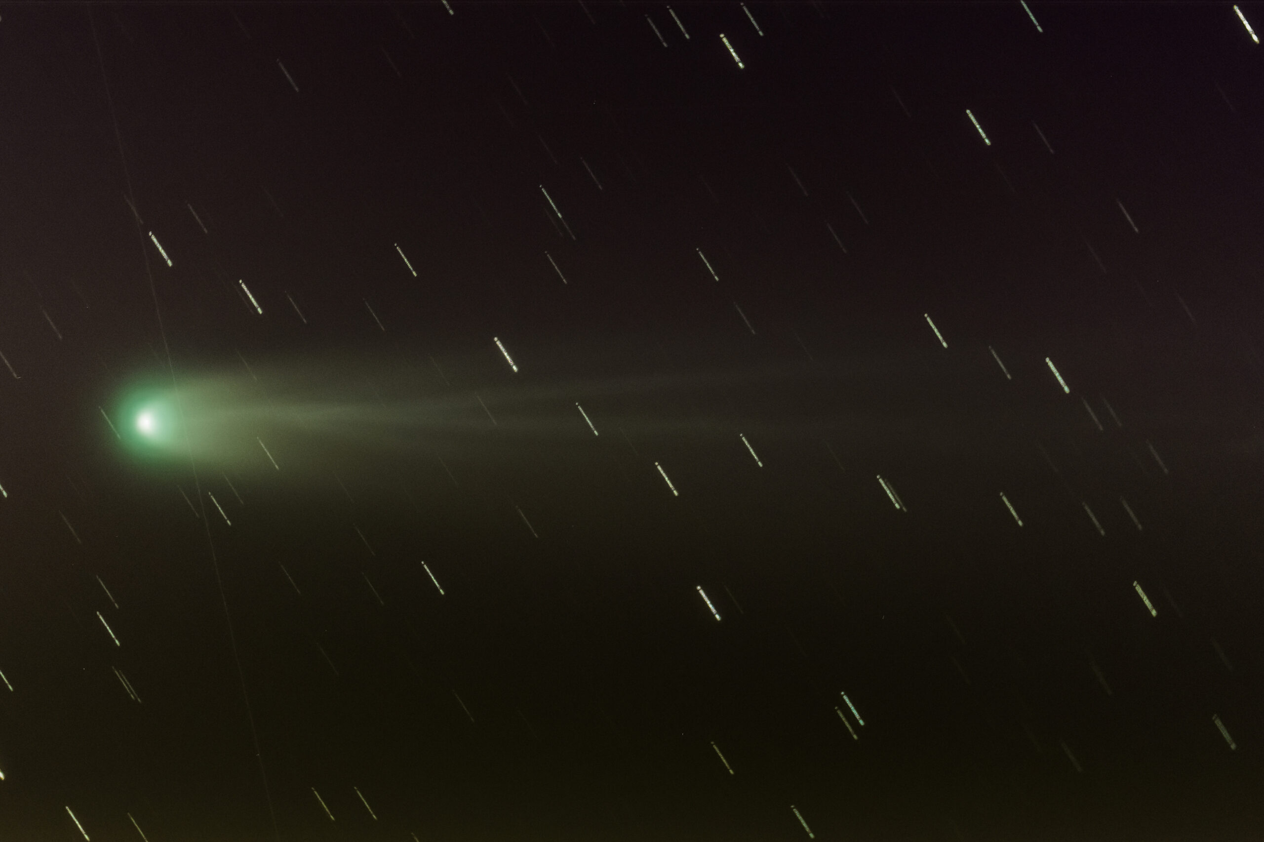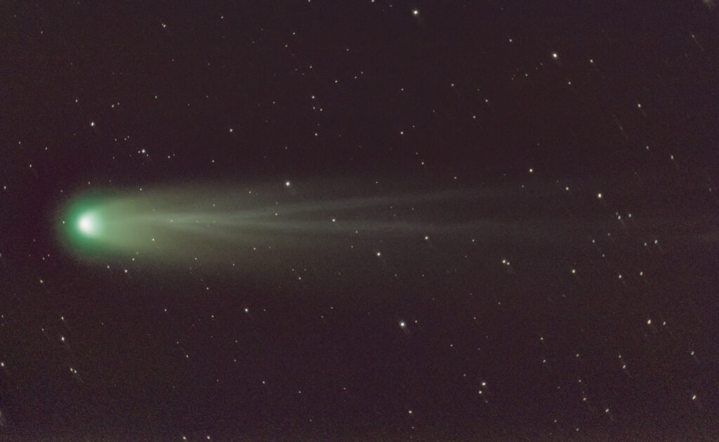 Dès le lendemain, il sort sont télescope et lui et shoote la belle vagabonde pendant presque 40 minutes à la tombée de la nuit. Malheureusement il devrait garder seulement 10 minutes de poses, car pour les poses suivantes, la comète se trouve dans le panache de fumée de la cheminée du voisin (et en plus elle descend sur l’horizon ce qui rend son observation encore plus délicate). Pendant le temps de la prise de vue, Carole et Guillaume suivent la comète avec une lunette ornithologique pour plus de confort.