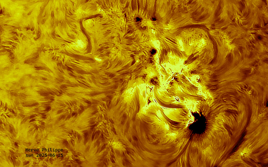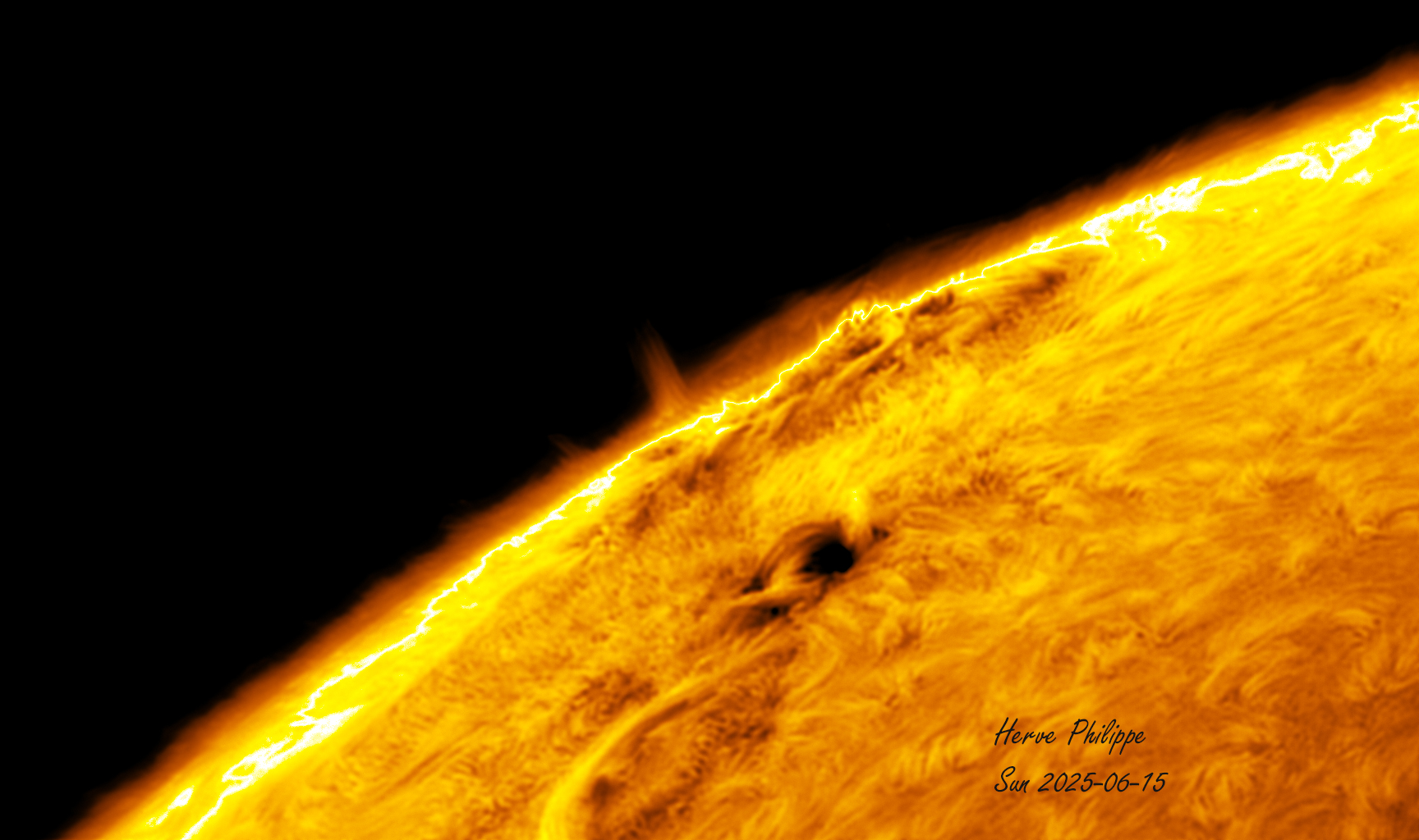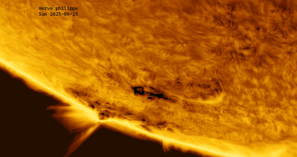 De son coté, Hervé préfère observer l’astre du jour, à savoir le Soleil, et nous propose de belles images en lumière H-alpha (ou l’on peux voir les détails de la chromosphère) et en lumière blanche filtrée (faisant apparaitre entre autres les taches solaire sur la photosphère).